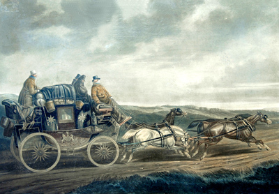 Elemento fondamentale di questi viaggi di angosce e piaceri del Gran Tour è la carrozza, ora intesa come strumento di trasporto ora come autentico emblema di un’epoca. Nella ricerca di aneddoti, informazioni e notizie su manuali e resoconti di viaggio, emerge come fosse importante, “l'etichetta” di viaggio che disciplinava le varie componenti di una pratica con lunga tradizione. Il viaggio materiale include diversi elementi che variavano a seconda delle disponibilità finanziarie di ognuno, dove il ricco poteva intraprendere il viaggio con propria carrozza e servitù, o a “noleggio” con l’ingaggio di un vetturino. Mentre il borghese viaggiava a seconda delle disponibilità della propria borsa con un “corriere” o con le normali carrozze da “posta”. La descrizione di una carrozza inglese in giro per l’Italia ci è fornita dai Tales of a Traveller (1822): chi ha visto nel continente una carrozza inglese di tipo familiare, avrà notato l’impressione che essa provoca: è una sintesi dell’Inghilterra, un piccolo lembo della vecchia isola che va caracollando per il mondo. Tutto è stipato, accogliente, ordinato e su misura. Le ruote volventi su assi brevettate prive di cigolii; la cassa ben sospesa su molle, cedevole ai movimenti ma protettiva ad ogni urto. Poi la cassetta e la serpa, cariche di servitù ben vestita, nutrita a manzo, e altera, che dall’alto guarda il mondo circostante con sovrano disprezzo, ciecamente certa che ogni cosa non inglese sia sbagliata. |
